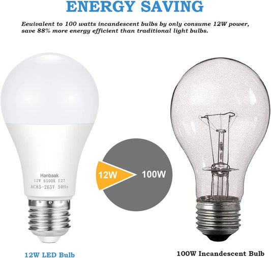 100W Equivalent Light Bulb, Hanbaak 12W E27 LED Bulbs Medium Screw Base, Non-Dimmable, Daylight White 6500K 4-Pack
