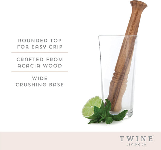 Twine Acacia Wood Muddler, Bar Accessory and Cocktail Drinkware Tool, Kitchen Essential with Jute Storage Pouch, Set of 1, Wood Grain