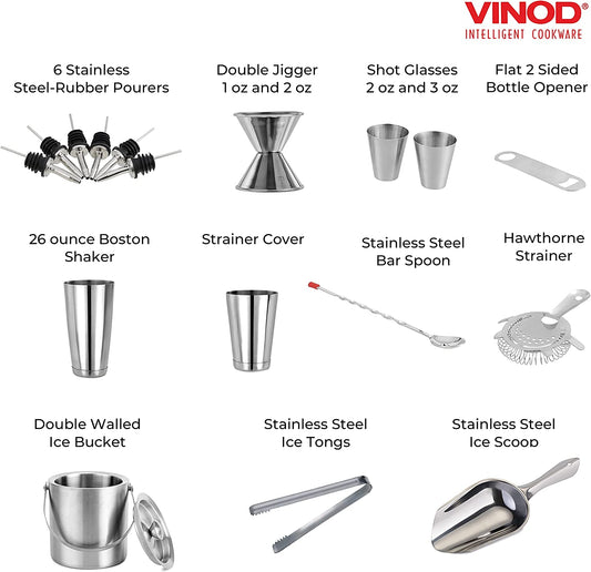 Stainless Steel Cocktail Set | 17 Piece Bar Accessories Set | 26 Ounce Boston Shaker w/Strainer Rubber Pourers Bar Jigger, Cocktail Spoon & More | Drink Mixer Bar Set | Bartender Kit