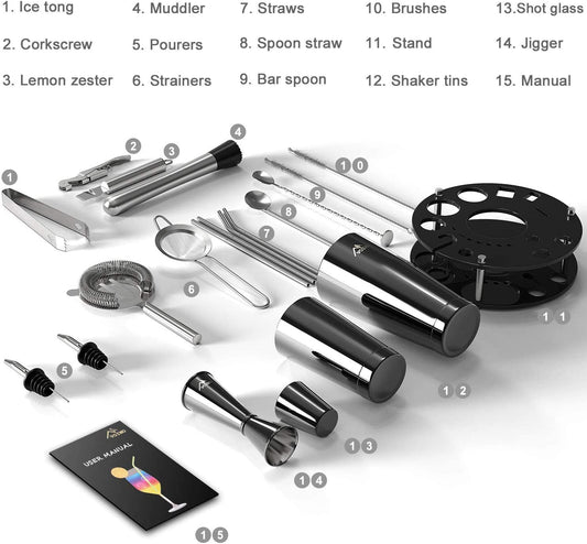 Craft Bartender Kit - 15 Piece Set Including Cocktail Shaker and Bar Accessories, Perfect for Drink Mixing at Home, Plus Exclusive Recipe Cards