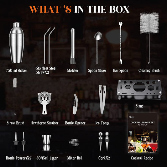 Cocktail Shaker Set, RATEL Bartender Kit 18 Piece Stainless Steel Bar Tools with Stand & Cocktail Recipes Booklet, Professional Bartender Shaker Set for Beginners Home Bar Parties