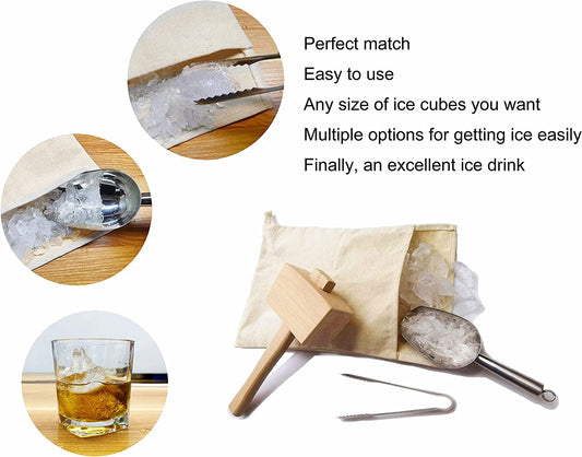 Lewis Bag and Ice Mallet,Ice Scoop and Clip,Manual Ice Crusher,Thick Canvas,Beech Wooden Mallet,Stainless Steel,Crushed Ice,Bar Tools Kitchen Accessories, 4 Pcs Set