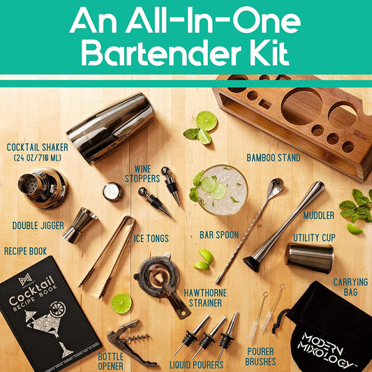 Bartender Kit: 23-Piece Bar Set Cocktail Shaker Set with Stylish Bamboo Stand | Perfect for Home Bar Tools Bartender Tool Kit and Martini Cocktail Shaker for Awesome Drink Mixing (Black)