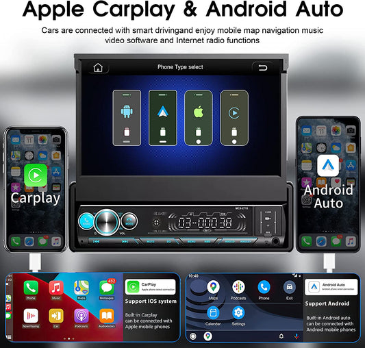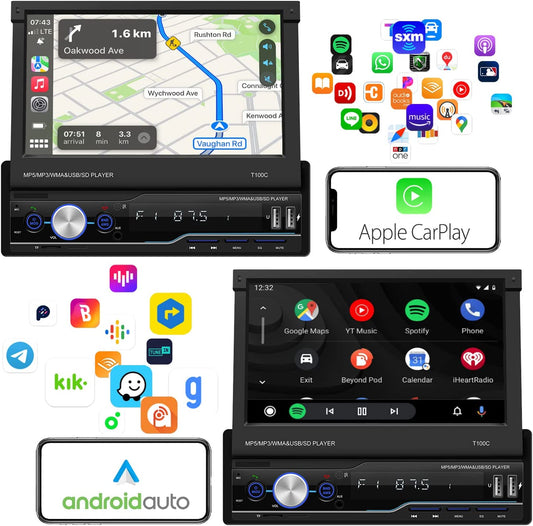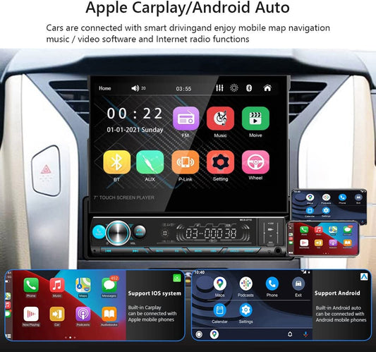 Single Din Car Stereo with Apple Carplay and Android Auto, 7 Inch Bluetooth Flip Out Head Unit with Subwoofer, USB/SD Port, A/V Input, FM Car Radio Receiver, Backup Camera