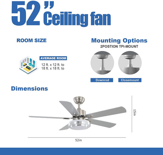 warmiplanet Ceiling Fan with Lights Remote Control, 52 Inch, Brushed Nickel (5-Blades)