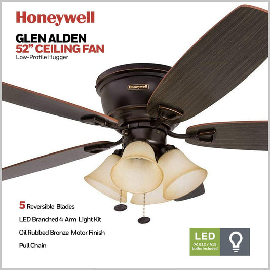 Honeywell Glen Alden 52-Inch Ceiling Fan with Sunset Shade Lights, Hugger/Flush Mount, Low Profile, Five Reversible Cimarron/Ironwood Blades, Oil-Rubbed Bronze
