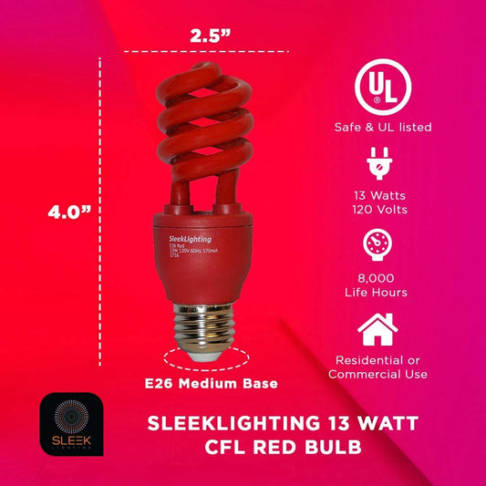 SleekLighting 13 Watt Red Bug Light Bulbs for Outdoor – General Purpose Spiral CFL Red Light Bulbs- UL Approved- Uses 13 Watts of Energy, 120 Volts, E26 Medium Base. (Pack of 2)