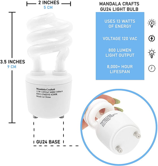 GU24 Light Bulb – CFL 13 w 120 v 60 hz Light Bulb – Compact Fluorescent Lightbulb with Two Prong Base T2 Mini Spiral 4 Pack 4200K Cool White by Mandala Crafts