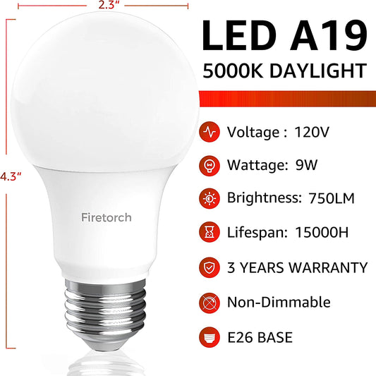 Firetorch A19 Led Bulb,9 W 60W Equivalent, E26 Led Light Bulbs Standard Replacement Bulb 750 Lumen,Non-Dimmable, UL Listed (5000K,4 Pack)