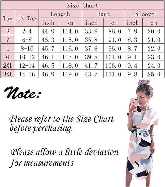 Womens Midi Dresses Summer V-Neck Short Sleeve Casual Office Geometric Belted Dress
