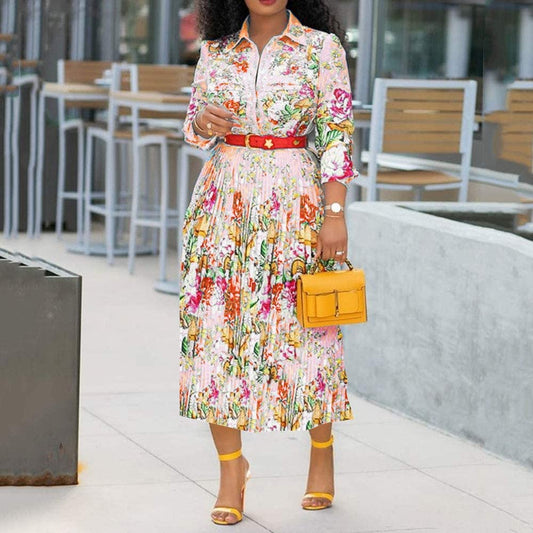 Lapel Three-Quarter Sleeve Knee Length Pleated Floral Women's Sheath Dress