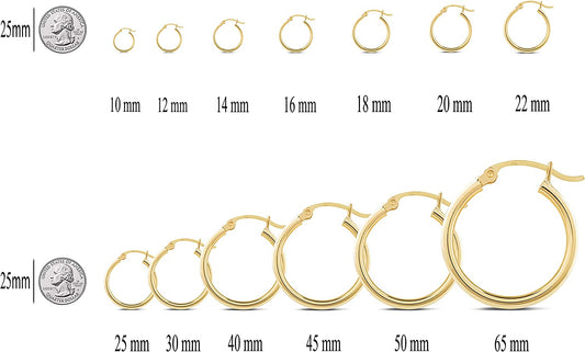 14K Yellow Gold Classic Shiny Polished Round Hoop Womens Earrings, 2mm - 3mm tube, 10mm - 65mm Diameter