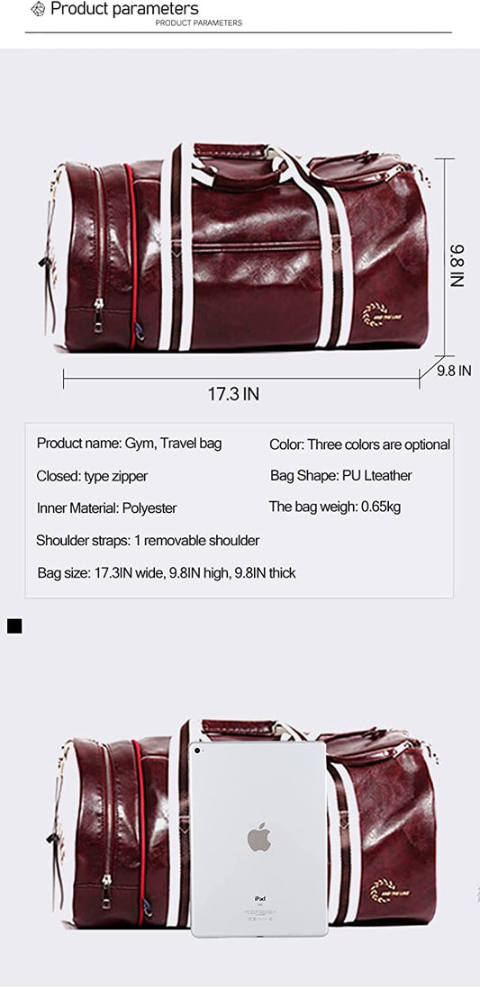 Leather Gym Sports Bag Retro Style Travel Duffel Bag, Cool Cylinder Waterproof Weekender Overnight Fitness Bag with Shoe Compartment & Wet Pocket for Men Women ( Claret Red )