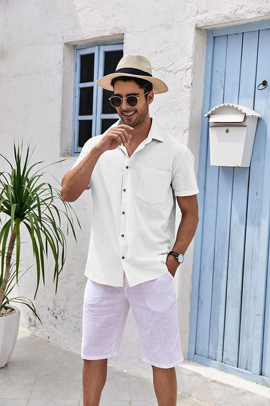 Mens Short Sleeve Button Up Shirts Linen Cotton Beach Tops Spread Collar Plain Summer T Shirt with Pocket