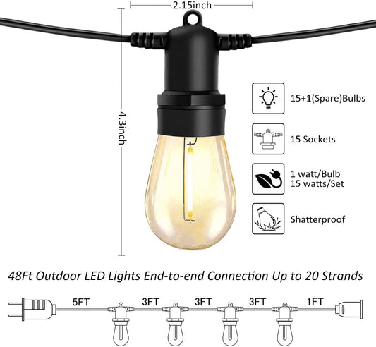 48FT LED Outdoor String Light, Waterproof Outdoor Patio LED Lights with Shatterproof Dimmable S14 Bulbs UL Listed Heavy-Duty Outdoor String Lights, Vintage Patio Lights for Wedding Party