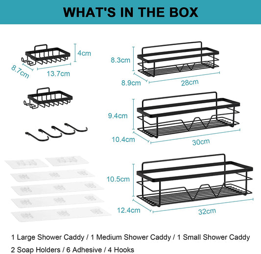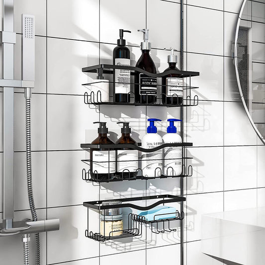 3 Pack Adhesive Shower Caddy Shelf Organizer with Soap Holder, Black Shower Wall Rack Storage Shampoo Holder Bathroom Organizer No Drilling for Kitchen, RV, Apartment Essentials