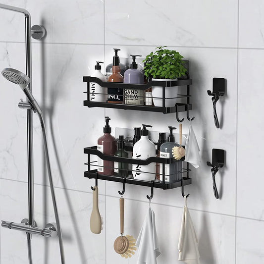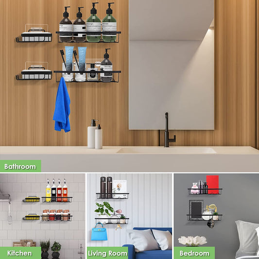 Shower Caddy Shelf with Hooks Storage Rack Organizer ,Can be wall-mounted without holes for Bathroom, Washroom, Restroom, Shower, Toilet, Kitchen - 4-Pack(Matte Black)