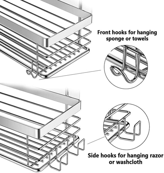 Orimade Shower Caddy with 5 Hooks Organizer for Hanging Razor and Sponge Bathroom Basket Adhesive Shower Shelf Storage Kitchen Rack Wall Mounted No Drilling Rustproof Stainless Steel - 2 Pack