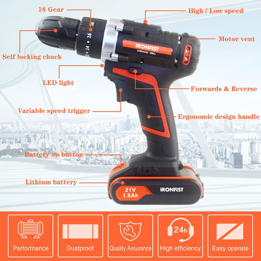 Cordless Drill, Screwdriver Impact Power Tools 21V Lithium Battery 45Nm Torque Setting with Led Light 2 Speed Driver