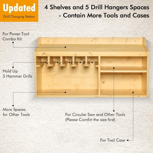 Power Tools Storage Organizers and Cabinets, Drill Charging Station, 5 Drill Hanging Slots, Wall Mount Impact Drivers Storage Dock with Widened Room for Circular Saw, Impact Wrench, Screwdriver Drill