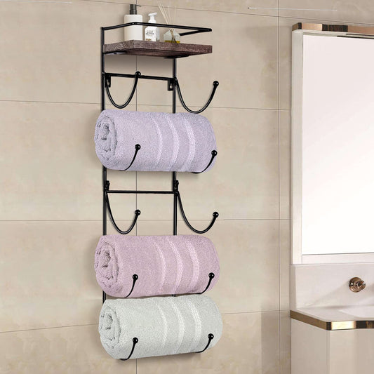 Premium Presents Bath Towel Rack in Bathroom. Wine Racks in Kitchen. Wall Mounted Shelves for Towels hat Organization. Great Decor Accessories. Metal Hooks. 3 Pieces Brand. (Black)