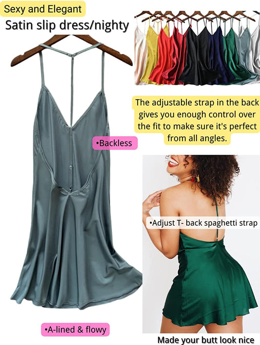 Kaei&Shi Silky Satin Nightie,Backless Lingerie for Women,Loose Sleepwear,Mini Nightgown,Spaghetti Strap Chemise