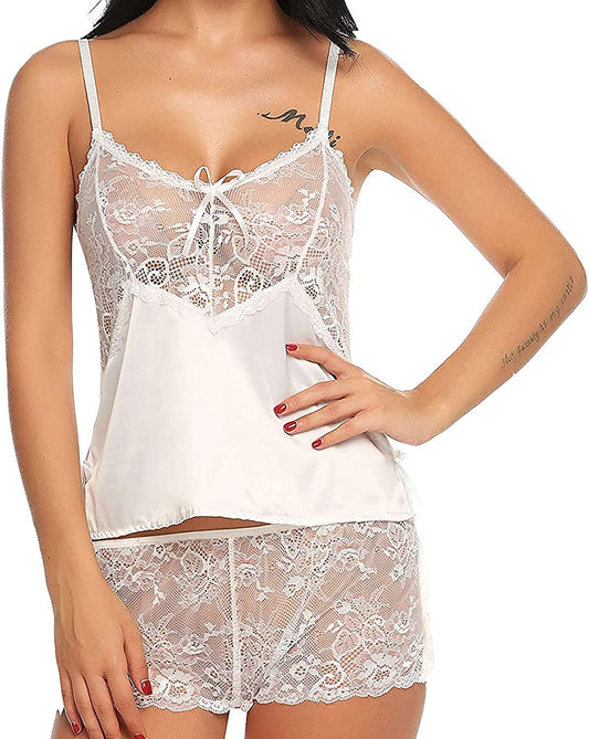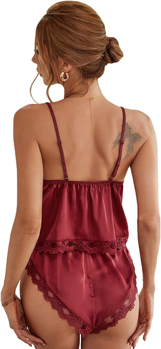 Women's Sleeveless Satin Lace Trim Lingerie Set 2 Piece Cami and Shortie