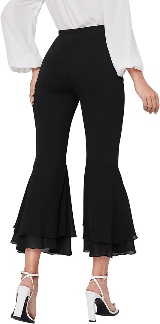 Women's Elastic Waist Layered Ruffle Flare Bell Cropped Pant