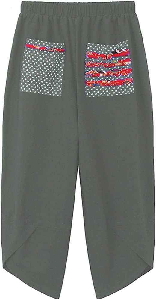 Women's Baggy Linen Wide Leg Trousers Casual Patchwark Elastic Waist Harem Pants