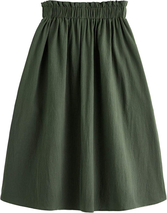 Women's Casual Paper Bag Waist A Line Pleated Midi Skirt with Pockets