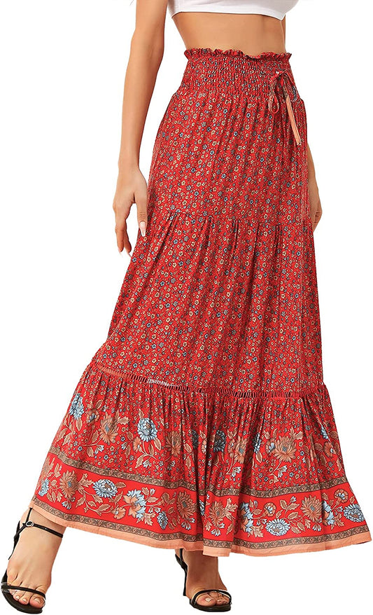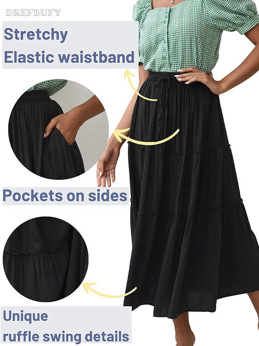 Women's Boho Elastic High Waist A Line Ruffle Swing Beach Maxi Skirt with Pockets