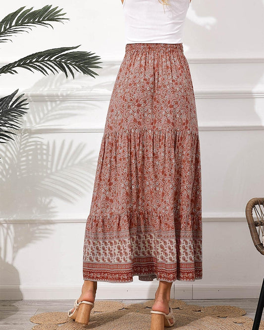 Women's Boho Elastic Waist Scarf Print Pleated Midi Skirt