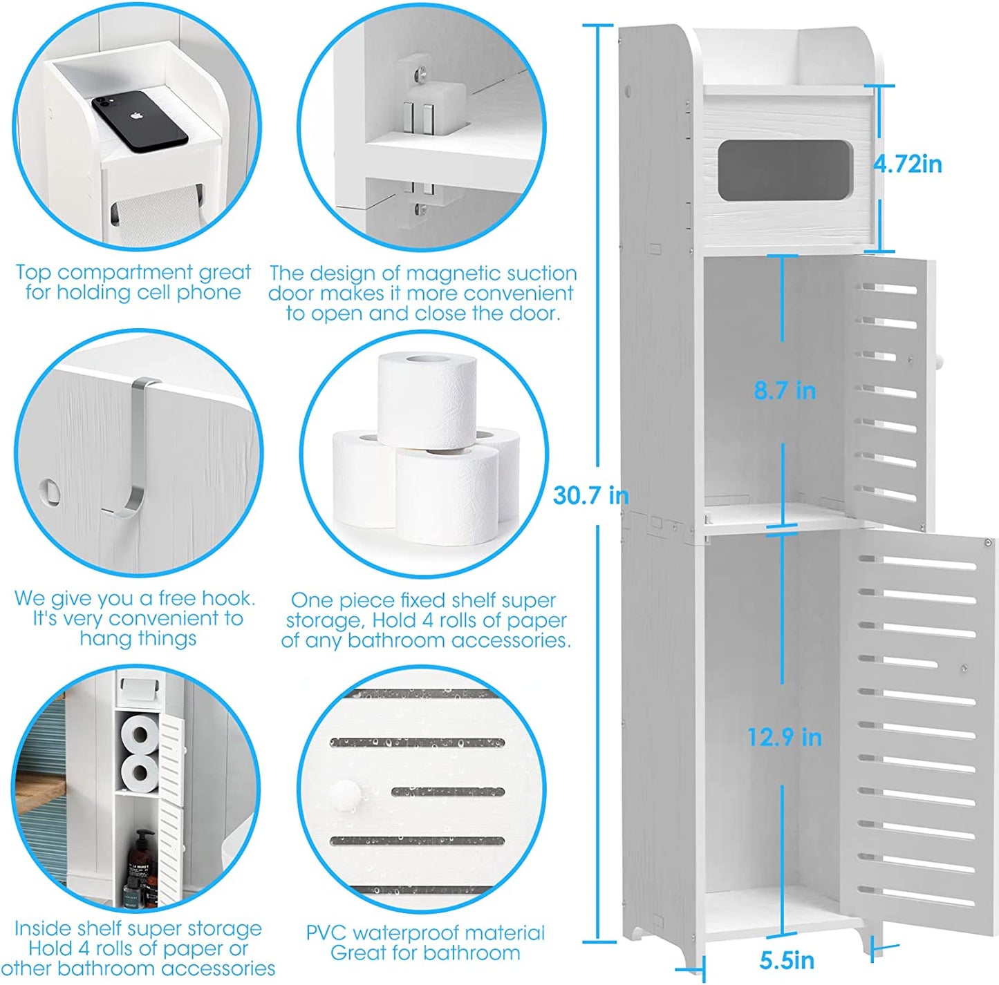 「Perfect 4 Tier Design」: The size of Bathroom Storage Cabinet after assembly is: W6.3" x D6"x H31" , four-layer design, the top panel is suitable for placing mobile phones or cups (can be opened to replace paper towels), the paper towel cabinet size is W5.7" x D5"x H5.2" (cannot accommodate roll paper larger than this size), the middle layer can be placed 2-3 rolls of paper; the bottom layer has a large space for storing various toiletries.
