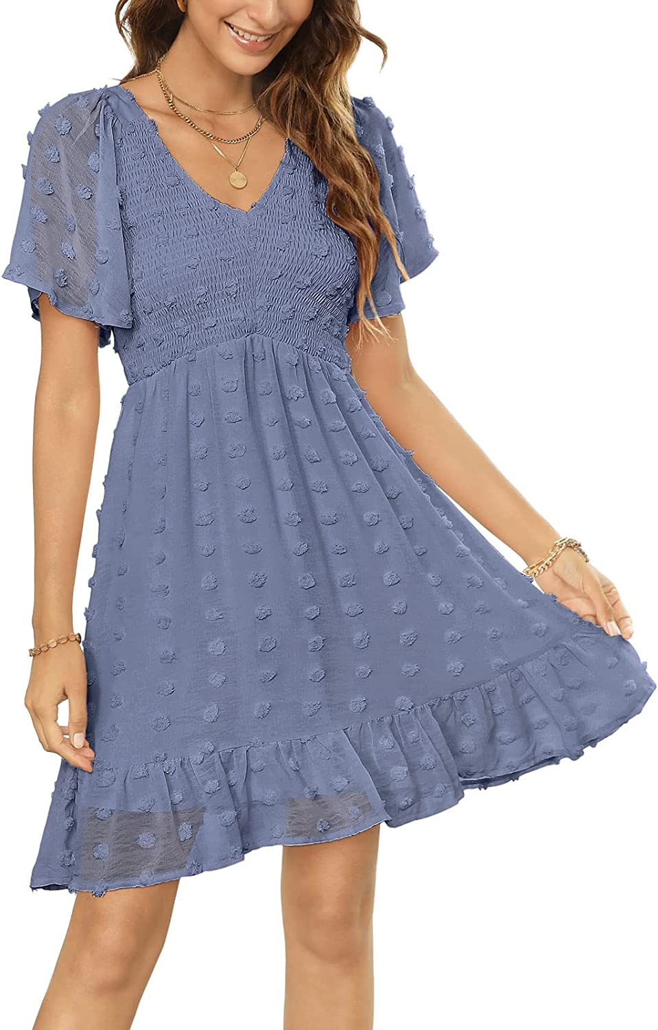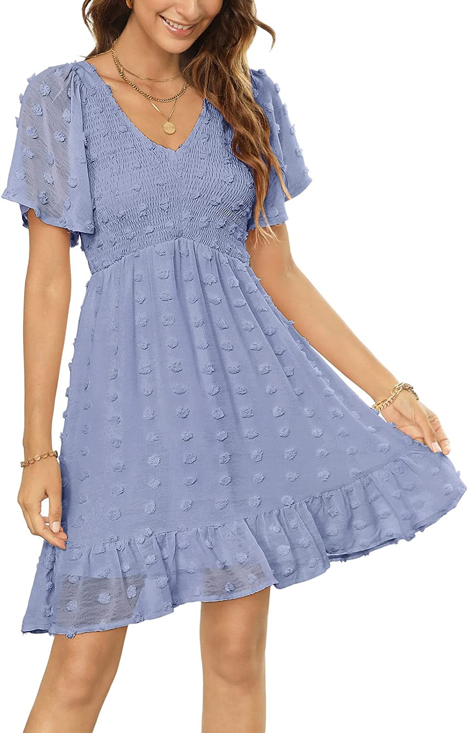 Womens Smocked Flutter Sleeve V Neck Ruffle Mini Swiss Dot Babydoll Dress